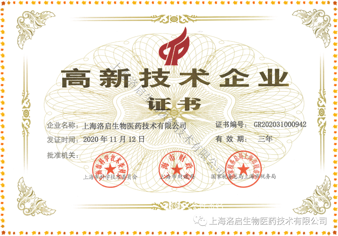 近期,上海OKPay钱包官网生物医药技术有限公司取得了由上海市科学技术委员会、上海市财政局、国家税务总局上海市税务局联合颁发的“高新技术企业证书”。