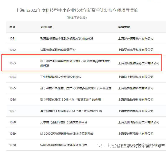 近期,上海市科学技术委员会组织的“上海市2022年度科技型中小企业技术创新资金计划”拟立项项目名单公示完毕,OKPay钱包官网生物“用于治疗重度哮喘的全新长效IL-5纳米抗体药物的临床前开发”项目入围。